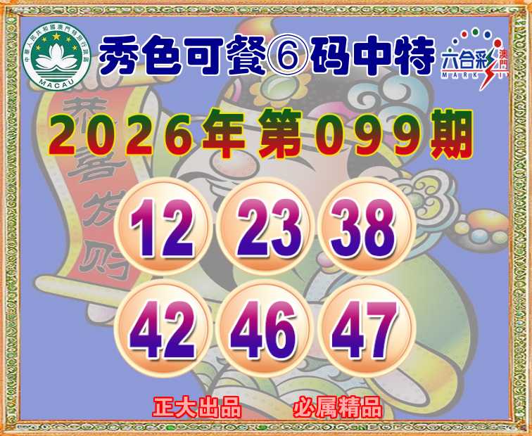 099期:【秀色可餐】⑥码中特⚽【12.23.38.42.46.47】开:12