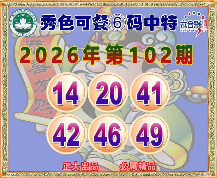 102期:【秀色可餐】⑥码中特⚽【14.20.41.42.46.49】开:20