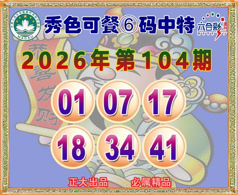 104期:【秀色可餐】⑥码中特⚽【01.07.17.18.34.41】开:01